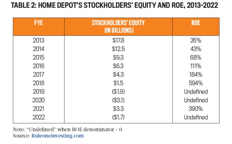 Table 2 shows the trends in Home Depot’s stockholders’ equity and ROE from 2013 to 2022. Stockholders’ equity began at $17.8 billion in 2013, declined to $1.5 billion in 2018, and fell into negative territory in 2019. Notice how ROE became inflated, rising from 26% in 2013 to 594% in 2018. Then it became mathematically undefined (due to a denominator < 0) in three of the following four years. This shows how the balance sheet can deteriorate due to stock buybacks.