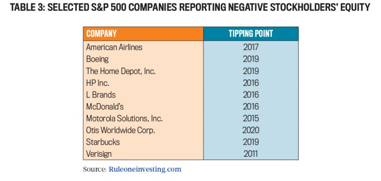 Companies continue to utilize stock buybacks as a tool to influence corporate financial conditions. According to Reuters, S&P 500 corporate common stock buybacks in the past few years have exceeded $500 billion annually. Initially considered a positive financial tactic, long-term use of stock buybacks (also known as stock repurchases) has caused some companies to slip into negative stockholders’ equity, which can bring a variety of financial difficulties. In recent years, companies including Boeing, Starbucks, The Home Depot, and McDonald’s have crossed a tipping point into negative stockholders’ equity as the result of many years of stock buybacks.