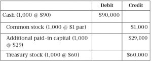 Let’s assume the 1,000 treasury shares are held for two years and then resold at $90 per share. The transaction would be recorded as: Resale of treasury stock at a higher price than buyback priceNotice that there’s no gain on this transaction even though the 1,000 shares were sold for $30 per share more than the buyback price. Both GAAP and U.S. federal tax laws are consistent on this issue that “gains” on the sale of a company’s own treasury shares aren’t recognized.