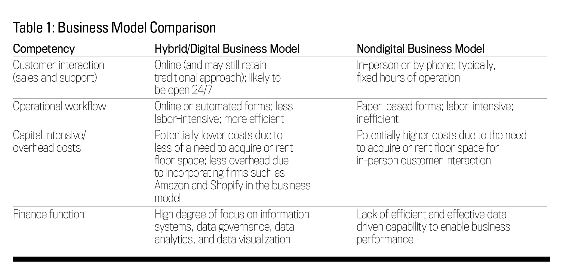 COVID-19 has accelerated digitization but also exposed those organizations that haven’t fully embraced the digital exchange of information. For each business that has failed to adapt, many have emerged with proven digital business models, such as telemedicine. The digitization of the finance function is essential for all businesses to remain competitive, which is why digitization is a central CFO mandate. See Table 1 for a few comparisons between digital and nondigital business models.