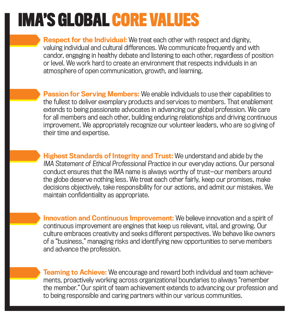 Chief among Jeff’s early priorities was composing a set of principles that would define what the association stood for and how it would achieve its goals. In November 2008, Jeff spent a weekend writing what would eventually become IMA’s Global Core Values, taking inspiration from AT&T’s values statement (“Our Common Bond”) and the Johnson & Johnson Credo while incorporating his own vision for how IMA should operate. After sharing his draft with the IMA Global Board of Directors, the senior leadership team, and the entire IMA staff (all but one of which were based in the U.S. at the time), the values were further refined and, eventually, institutionalized at IMA, reflecting the association’s commitment to its members, emphasis on ethics, and focus on innovation (see “IMA’s Global Core Values”).