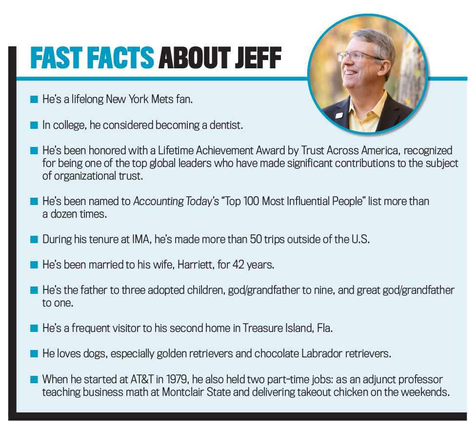 After nearly three years as a high school math teacher, Jeff joined IMA as vice president of research and practice analysis in 2005. He knew very little about the organization when he joined. The best part of that first IMA job was its similarity to the kind of work he most enjoyed at AT&T: serving in a market-facing role. Jeff conducted research on behalf of the profession and helped to expand the management accounting body of knowledge, authoring or coauthoring reports on topics such as leadership, risk management, and internal controls.
