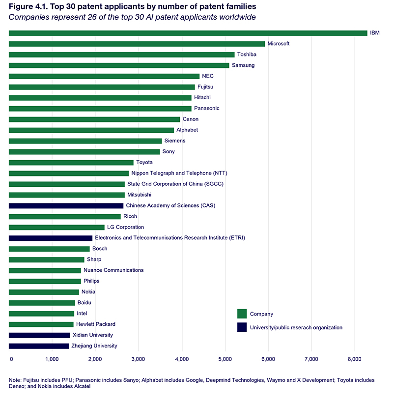 Sorting the data to find the top 30 AI patent applicants identified two general tracks: companies and academic enterprises—universities and public research organizations. For now, companies hold 26 out of the top 30 positions for applicants, and the remaining four spots are assigned to schools and research organizations.