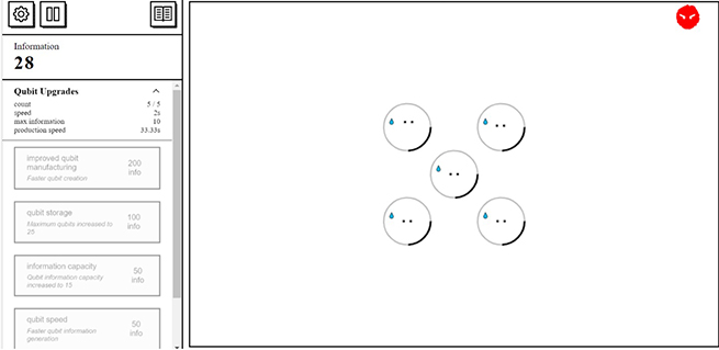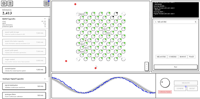 With the opening screen, you’re presented with a single qubit looking to cohere and to increase in number and the amount of information it can hold. At the same time, you have to use your mouse to brush away constant single and then multiple threats from heat and radiation (red dots) while you’re checking your growing array of qubits and the menus for additional information and help. One of the help screens has a glossary of essential terms, so there’s traditional learning from looking things up, but it’s the dynamic interplay that presents you with the complex of obstacles and problems the engineers face building their machines. The game gets complicated fast, and there are multiple levels to explore and master.