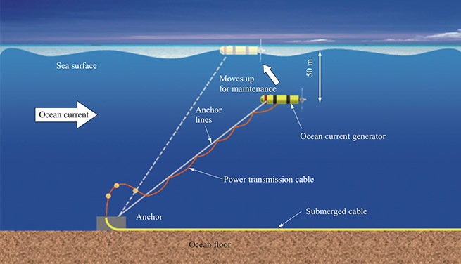 The heavy-machinery manufacturer IHI Corporation of Japan has demonstrated the world’s largest ocean-current turbine called Kairyu, a 100 kW-class ocean-current power generator. The system is designed for use in the Kuroshio, one of the world’s most powerful ocean currents. IHI engineers estimate, “If the energy present in the Kuroshio could be harnessed, it would amount to approximately 205GW, which is comparable to Japan’s total electric power generation.” The Kuroshio, off the eastern coast of Japan can be up to 100 kilometers across, wide enough to accommodate a large-scale power-generation farm.